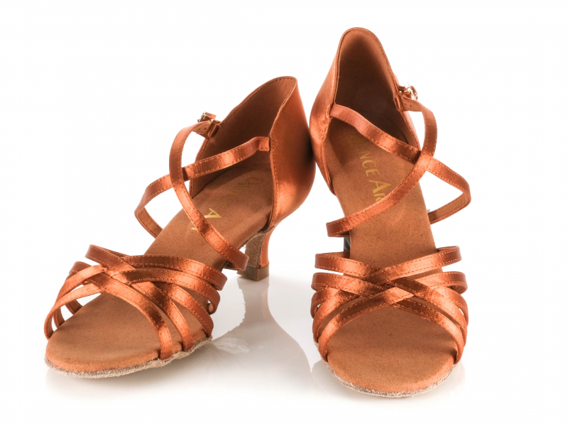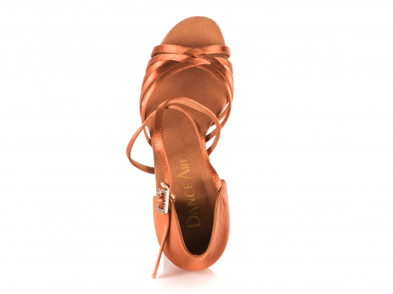 Die zehenoffene Sandalette aus edlem dark tan Satin verleiht dem Schuh eine warme, elegante Ausstrahlung und sorgt für ein klassisches Turnier-Finish. Mit der verstellbaren Dornschnalle lässt sich der Schuh individuell anpassen und bleibt auch bei schnellen Drehungen und anspruchsvollen Figuren sicher am Fuß.