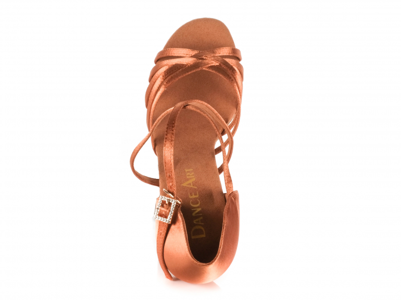 Die zehenoffene Sandalette aus edlem dark tan Satin verleiht dem Schuh eine warme, elegante Ausstrahlung und sorgt für ein klassisches Turnier-Finish. Mit der verstellbaren Dornschnalle lässt sich der Schuh individuell anpassen und bleibt auch bei schnellen Drehungen und anspruchsvollen Figuren sicher am Fuß.