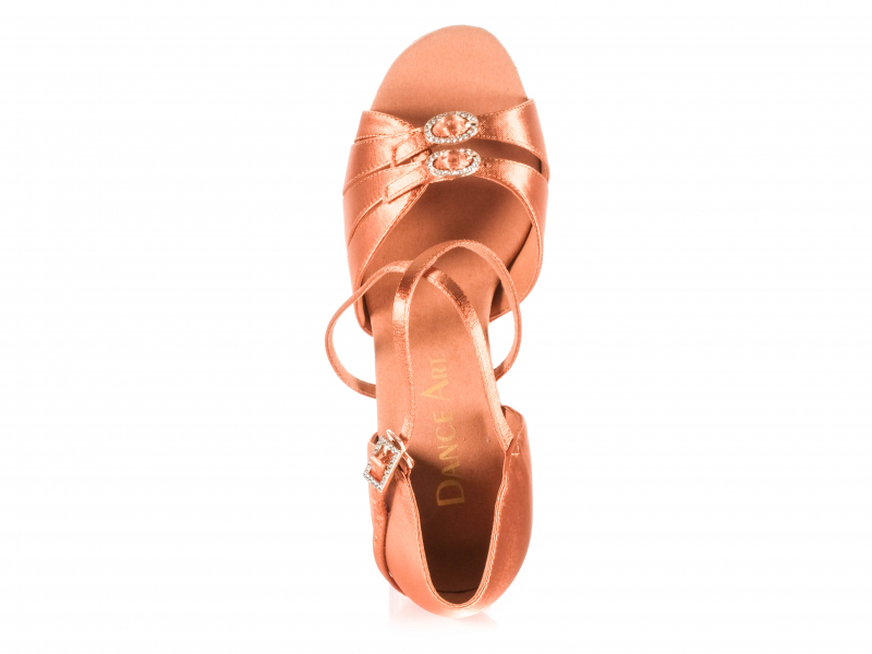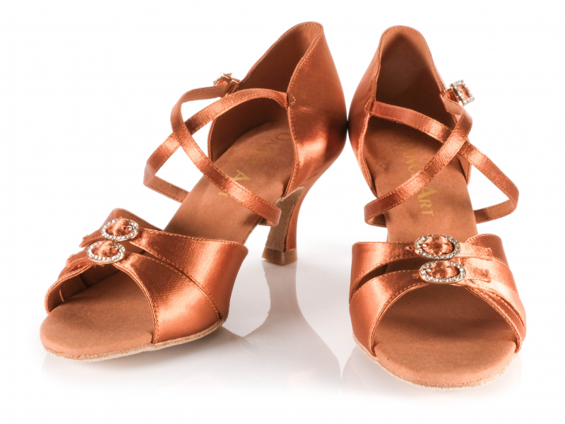 Die zehenoffene Sandalette aus edlem dark tan Satin besticht durch ihre geschmeidige Linienführung und ihren sanften Glanz, der auf der Tanzfläche pure Eleganz ausstrahlt. Der Fersenriemen mit einstellbarer Dornschnalle sorgt zusätzlich für Stabilität und eine präzise Passform – ideal für schnelle Drehungen und dynamische Figuren.