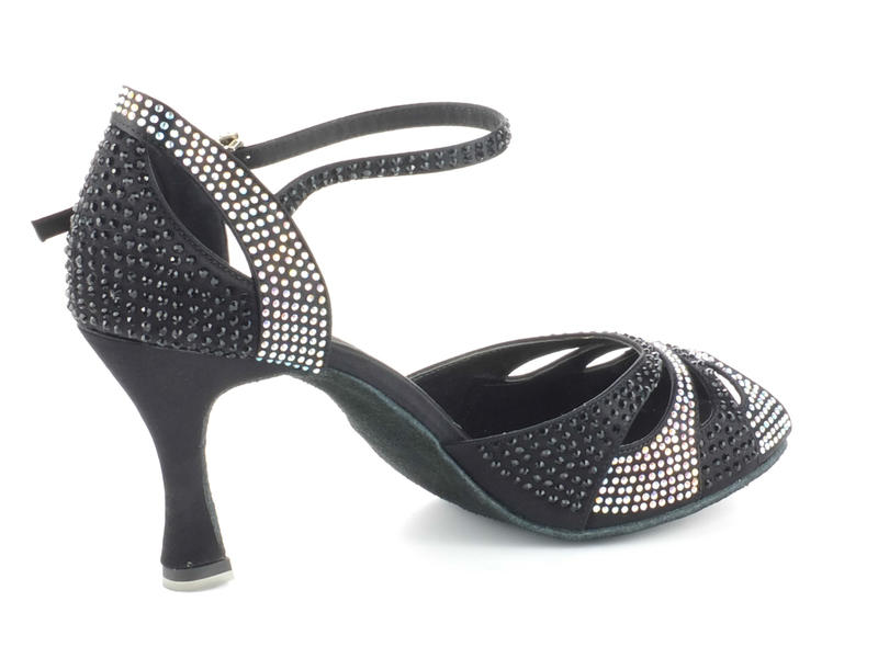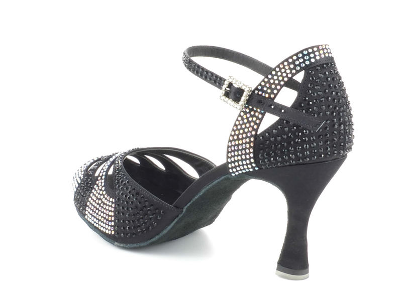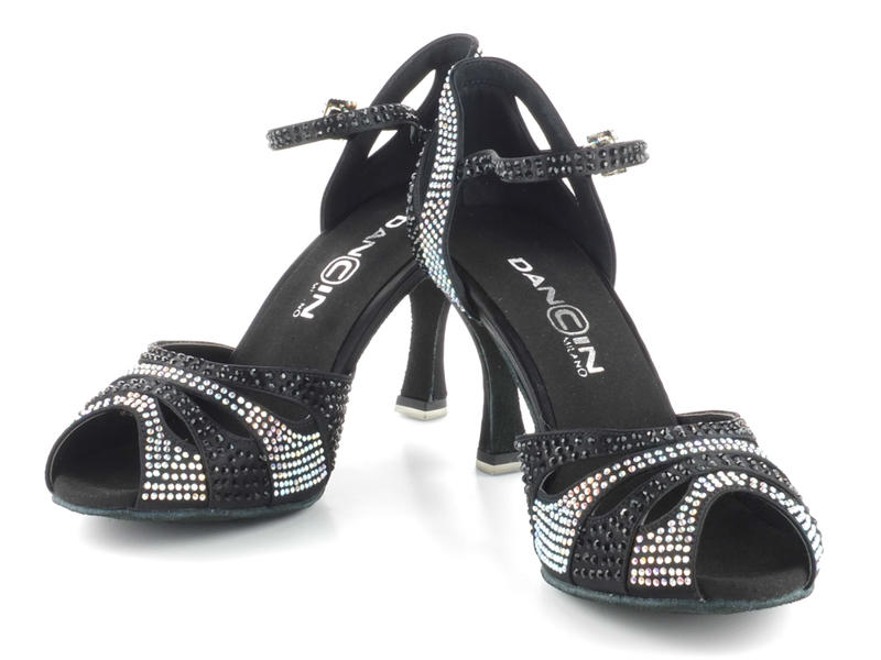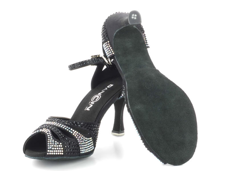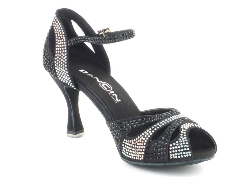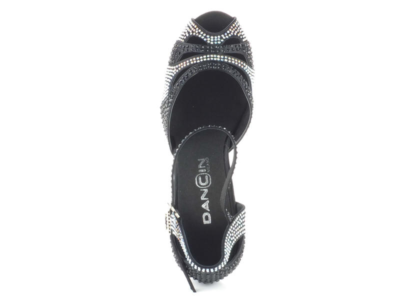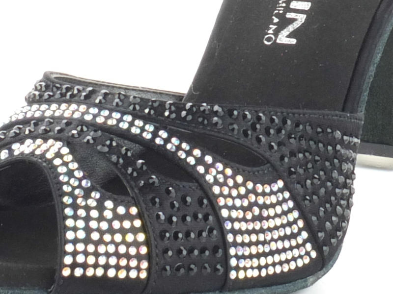 Wie man einer eigentlich klassischen Form einen neuen Dreh mitgeben kann, zeigt dieser Dancin Milano Damen Latein Tanzschuh aus schwarzem Satin. Die typische Peeptoe-Sandalette mit durchbrochener Ferse und Vorderblatt wird durch zweifarbige Kristallsteinapplikationen in Weiß und Schwarz akzentuiert und zeigt so bei jedem Schritt im Scheinwerferlicht ein anderes Funkeln.