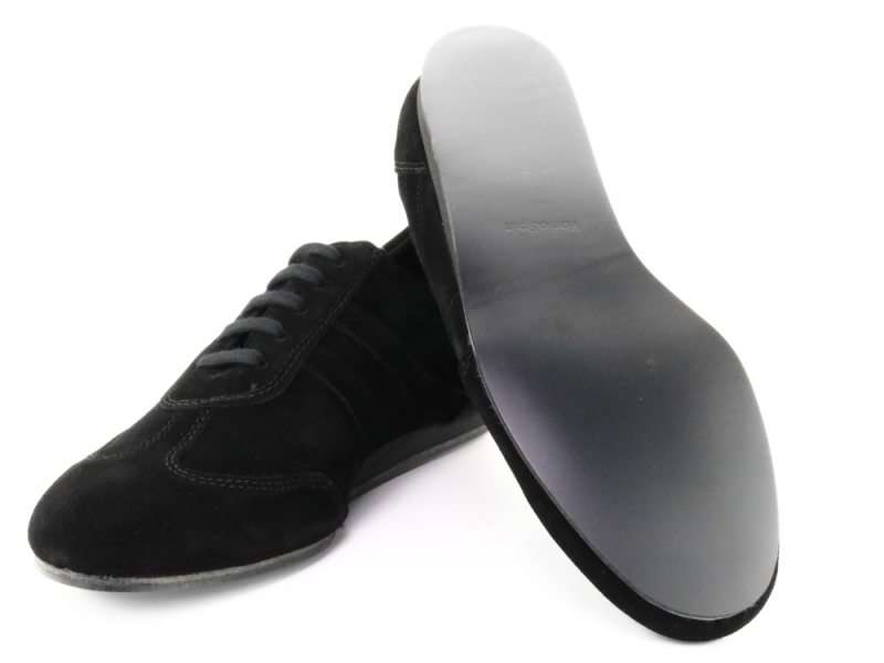 Damit auch Ihre Füße nach langen Trainingseinheiten immer noch Spaß am Tanzen haben, sollte dieser Diamant Herren Sneaker aus schwarzem Velourleder in keinem Schuhschrank fehlen. Zusätzlich überzeugt er durch die innovative neue VarioSpin-Tanzsohle. Diese spezielle Sohle ermöglicht Ihnen das Tanzen auf jedem Bodenbelag. Egal an welchem Ort Sie Tanzen möchten mit diesen Tanzschuhen gleiten Sie auf Parkett, Teppich, Kunststoff oder Stein gleichermaßen - Ihnen sind keine Grenzen gesetzt. Auch für Swing und Rock n Roll sind Sie mit diesem sportlichen Oxford immer sicher und blasenfrei ausgestattet. Besonders breite Füße der Kategorie K werden sich dank geschlossener 6-Lochschnürung und gepolstertem Schaftrand bequem aufgehoben fühlen.