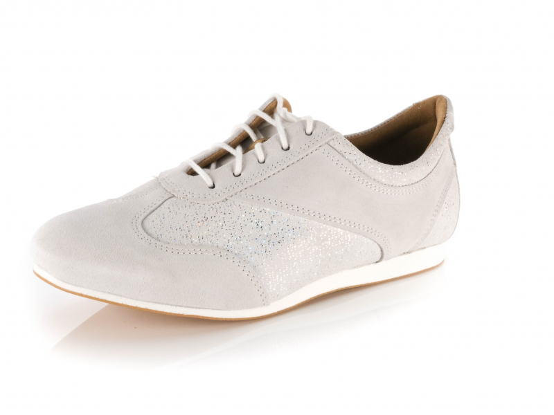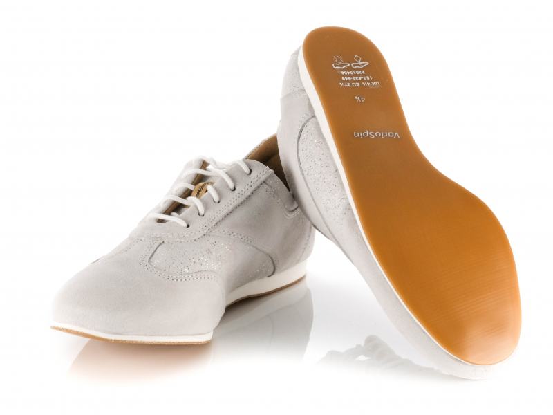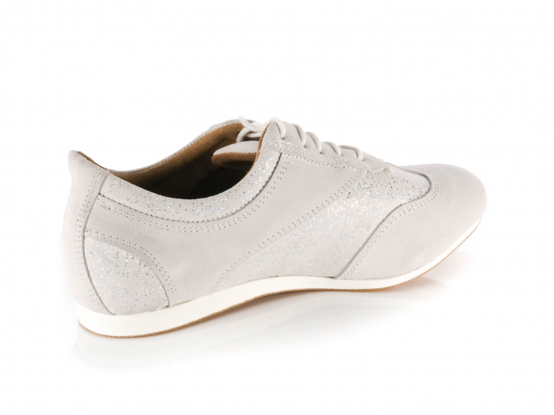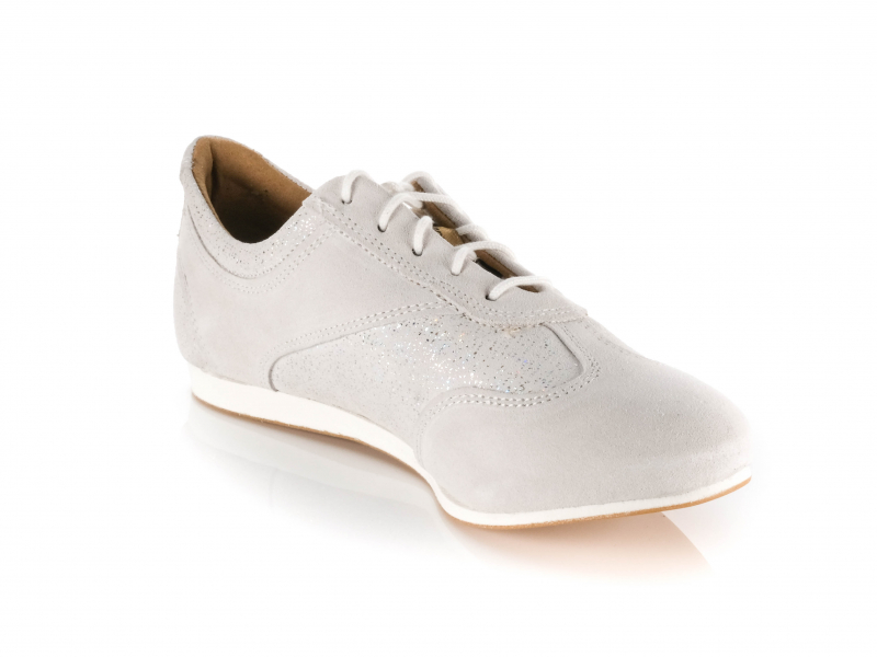 Setzen Sie auf sportliche Eleganz und maximale Bewegungsfreiheit mit diesem handgefertigten Damen Trainer-Tanzschuh in Weiß-Grau. Die Kombination aus weichem Velourleder und schimmerndem Diamantstaub-Velour verleiht dem Modell eine moderne, dynamische Optik – perfekt für anspruchsvolle Tänzerinnen, die Technik und Stil vereinen möchten.