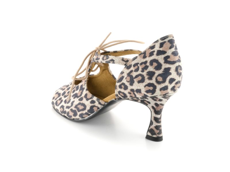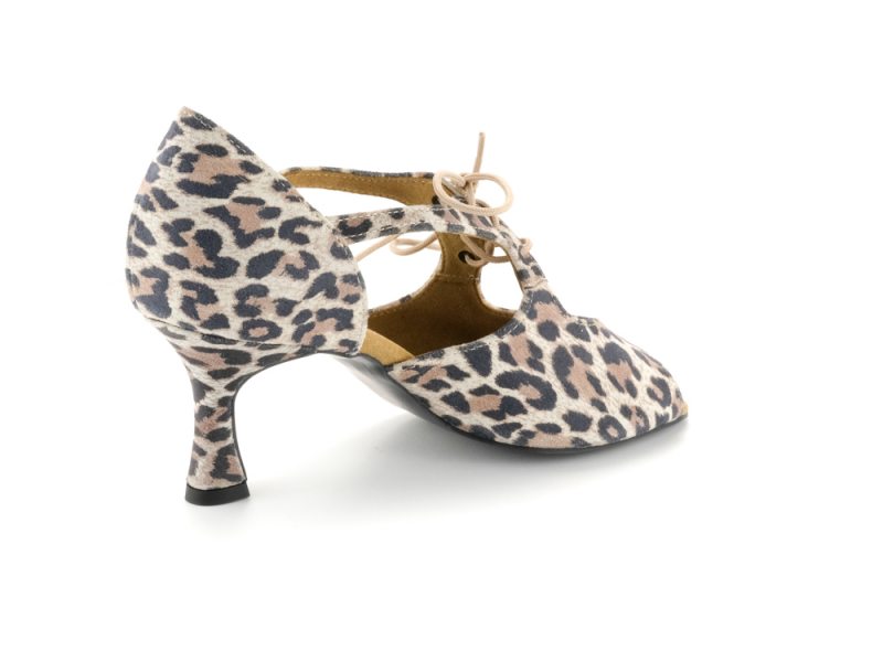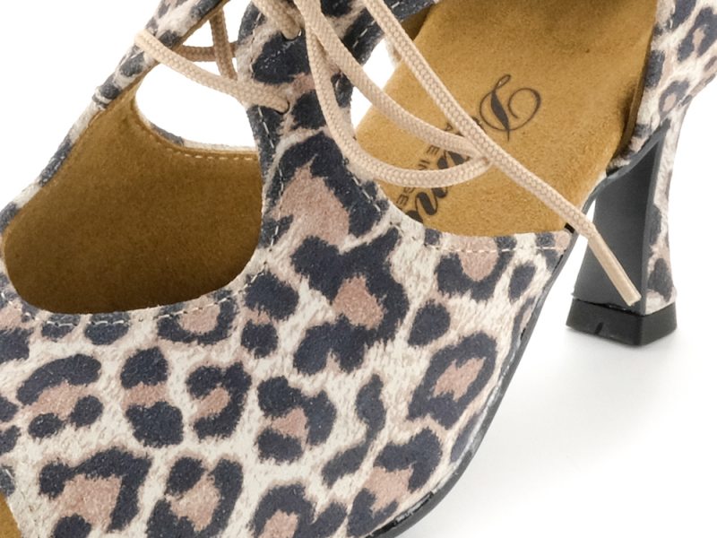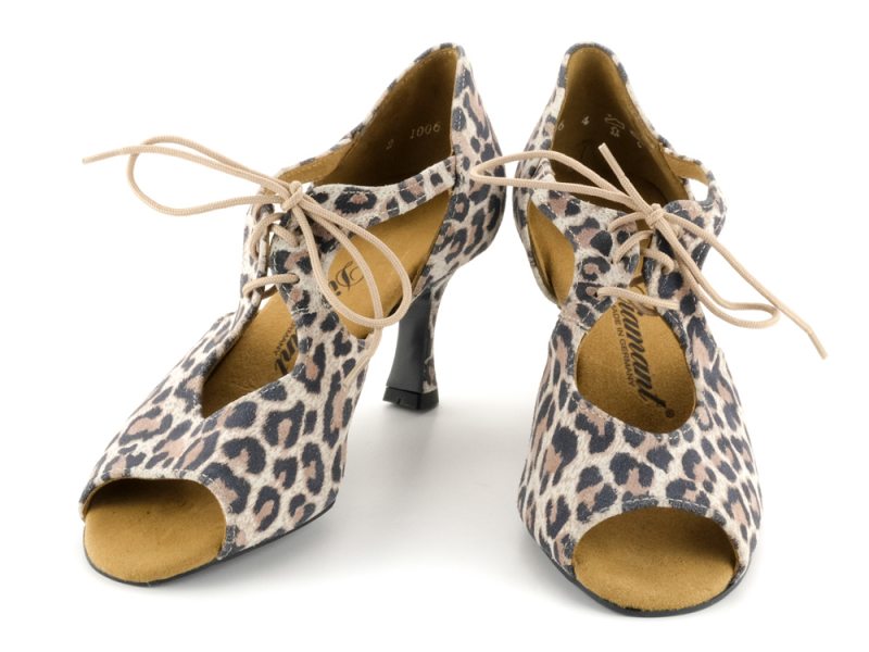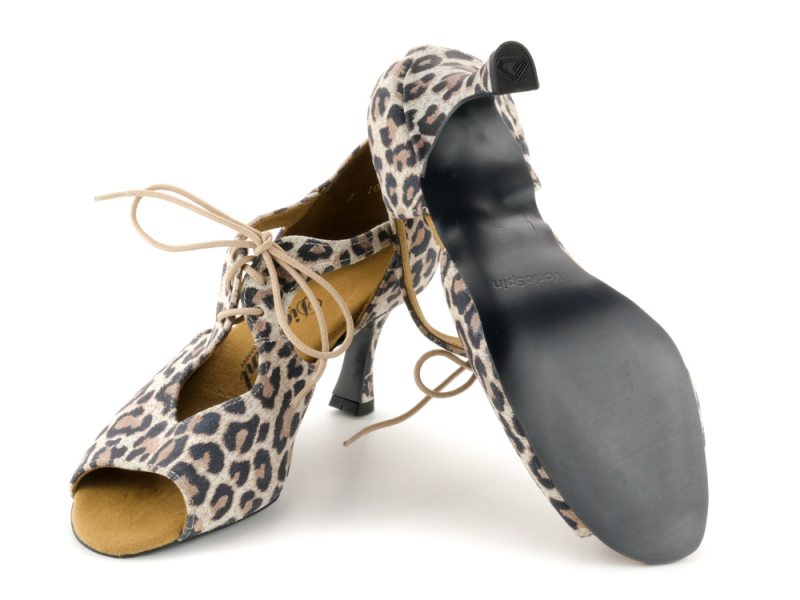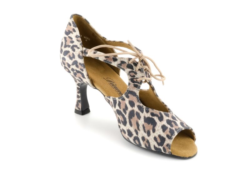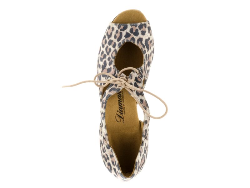 Für manche Auftritte und Tanzgelegenheiten muss es ein besonderer Schuh sein. Und dies ist zum Beispiel dieser offene Diamant Damen Tanzschuh aus Velourleder mit Leopard-Optik. Zusätzlich überzeugt er durch die innovative neue VarioSpin-Tanzsohle. Diese spezielle Sohle ermöglicht Ihnen das Tanzen auf jedem Bodenbelag. Egal an welchem Ort Sie Tanzen möchten mit diesen Tanzschuhen gleiten Sie auf Parkett, Teppich, Kunststoff oder Stein gleichermaßen - Ihnen sind keine Grenzen gesetzt. Der Profi-Pump mit offener 4-Lochschnürung und 6,5 cm Flareabsatz zitiert die klassische Formensprache von Tango und getragenen Lateintänzen und unterstreicht dezent jeden Schritt.