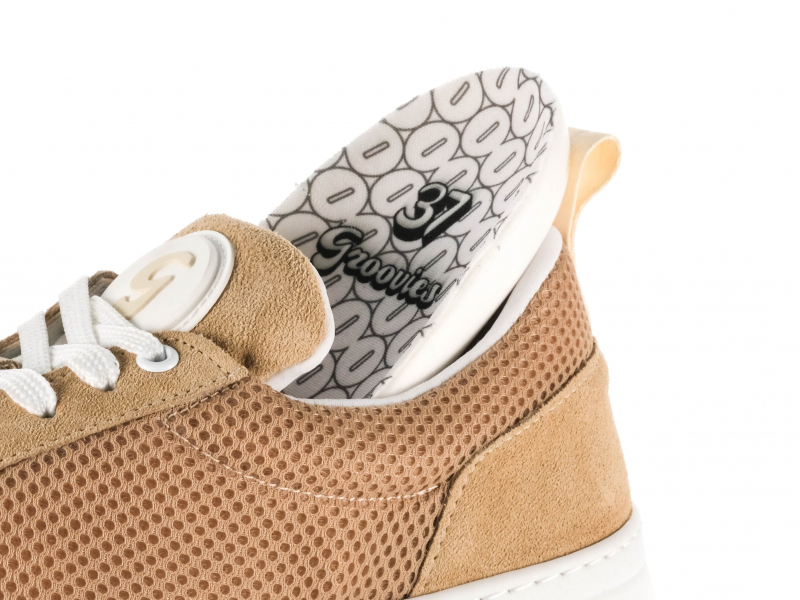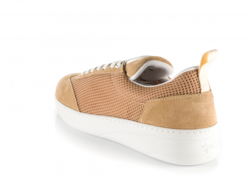 Die Kombination aus beigem Leder und luftdurchlässigem Mesh sorgt für eine elegante, sportliche Optik und ein angenehm leichtes Tragegefühl. Besonders bei längeren Trainingseinheiten überzeugt das atmungsaktive Material durch ein frisches Fußklima.