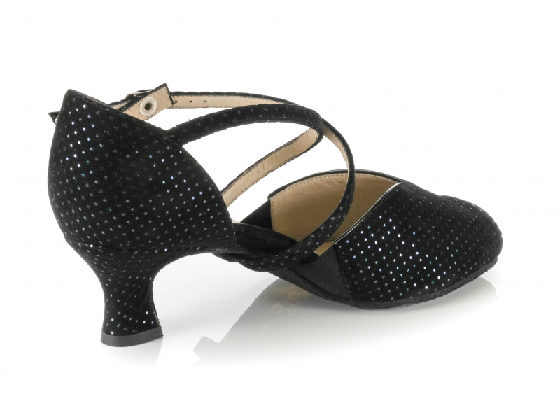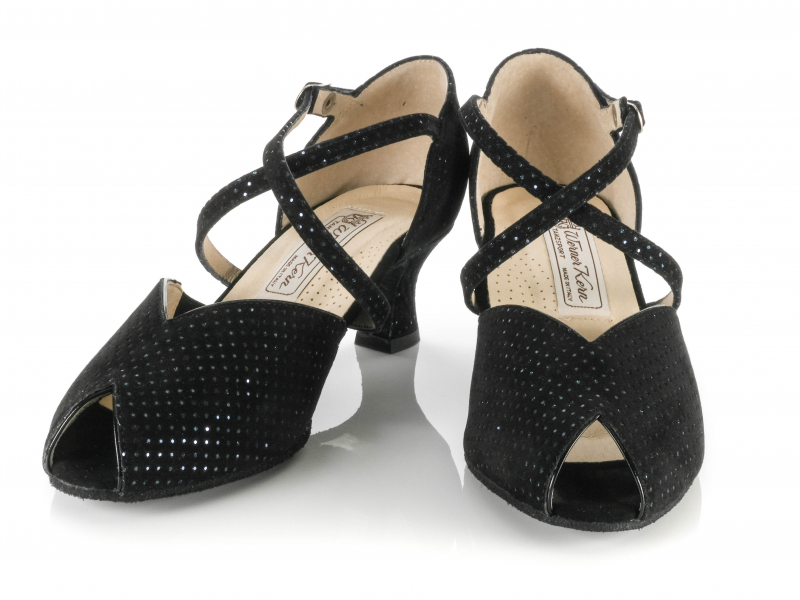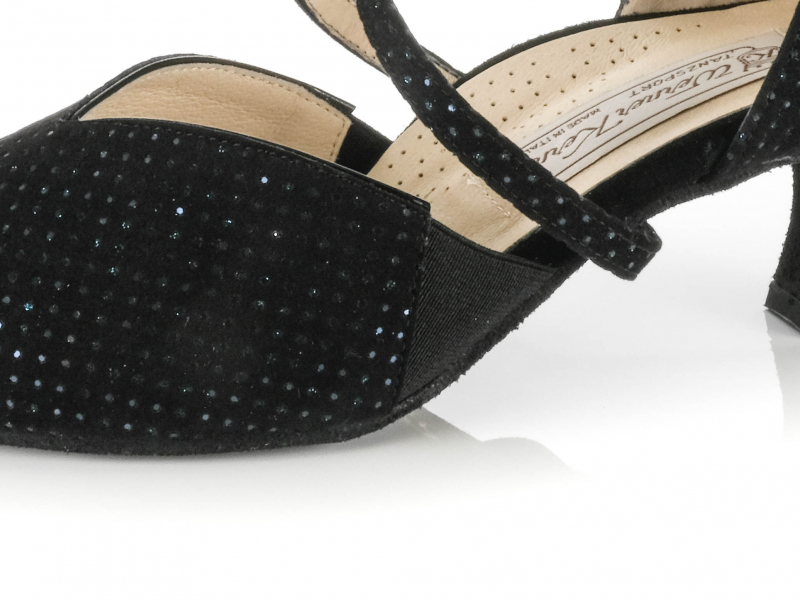 Eleganz, Komfort und Flexibilität – Harriet von Werner Kern bringt alles mit, was ein moderner Tanzschuh für lange Nächte auf dem Parkett braucht. Das offene Design mit schwarzem Brokat und feinem blauen Glitzer macht diesen Schuh zu einem echten Blickfang, ohne dabei aufdringlich zu wirken. Besonders praktisch: Ein seitlicher Elastikeinsatz sorgt für eine ideale Anpassung an den Fuß – perfekt für breitere Füße oder Tänzerinnen, die auf besondere Bequemlichkeit angewiesen sind.