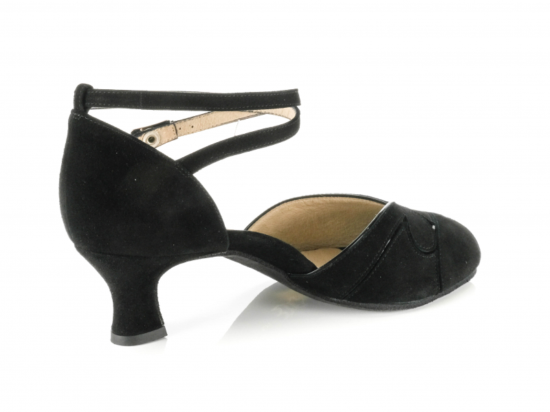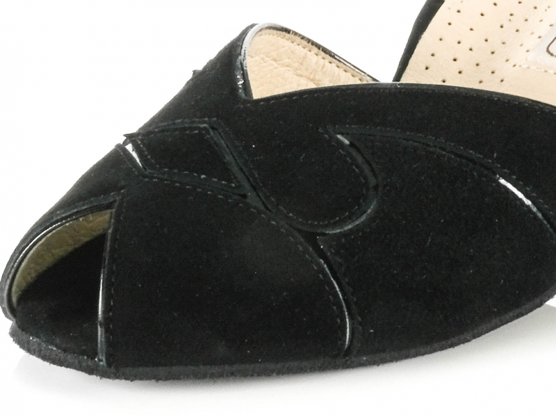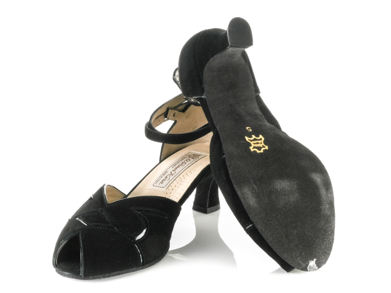 Der Tanzschuh Nellie von Werner Kern vereint dezenten Glamour mit höchstem Komfort – perfekt für Tänzerinnen, die Eleganz und Wohlbefinden gleichermaßen schätzen. Gefertigt aus weichem schwarzem Velourleder und edel schimmerndem Lack, verleiht er jedem Schritt Ausdruck und unterstreicht Ihre Persönlichkeit auf der Tanzfläche. Der Peeptoe sorgt für Leichtigkeit und eine moderne Note, während das elegante Kreuzristriemchen sicheren Halt bietet und dem Fuß eine feminine Silhouette verleiht.