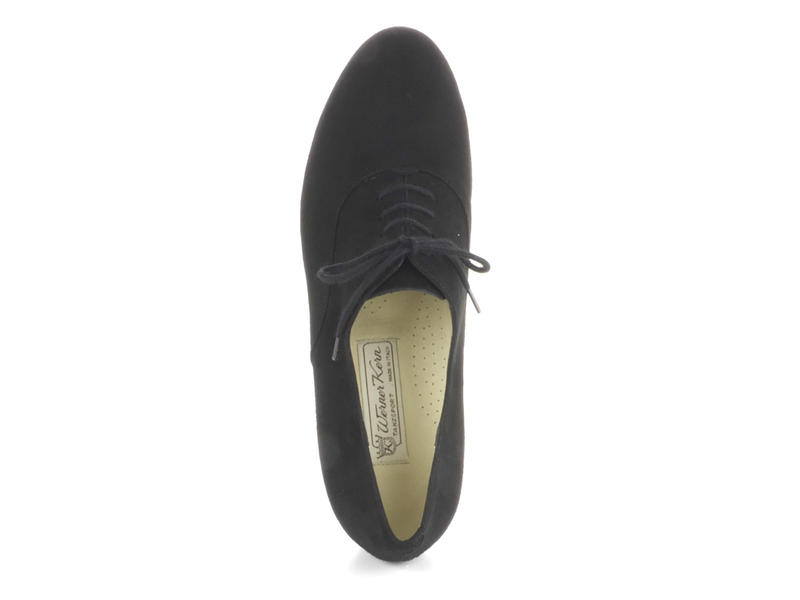 Dieser Werner Kern Damen Standard-Tanzschnürer aus schwarzem Ziegenveloursleder zeigt sein Feuer ganz subtil. Die fein gearbeitete Passgenauigkeit vereint sich mit einem Fußbett aus Leder, das Schweiß zuverlässig aufnimmt und vom Fuß wegleitet. Die Latexzwischensohle bietet einen immensen Vorteil bei langen Trainingseinheiten – der Schuh ist kaum zu spüren. Für sicheren Stand sorgt der 3,4 cm Tango-Absatz, der auch schnelle Schrittfolgen mit schockabsorbierender Fersendämpfung abfedert.