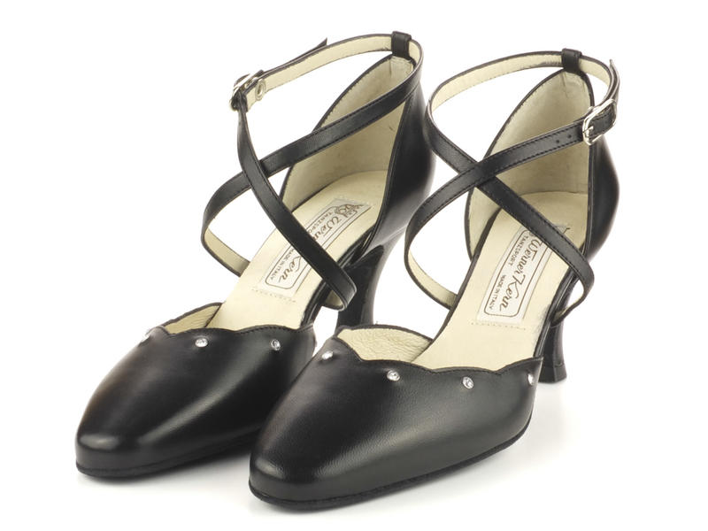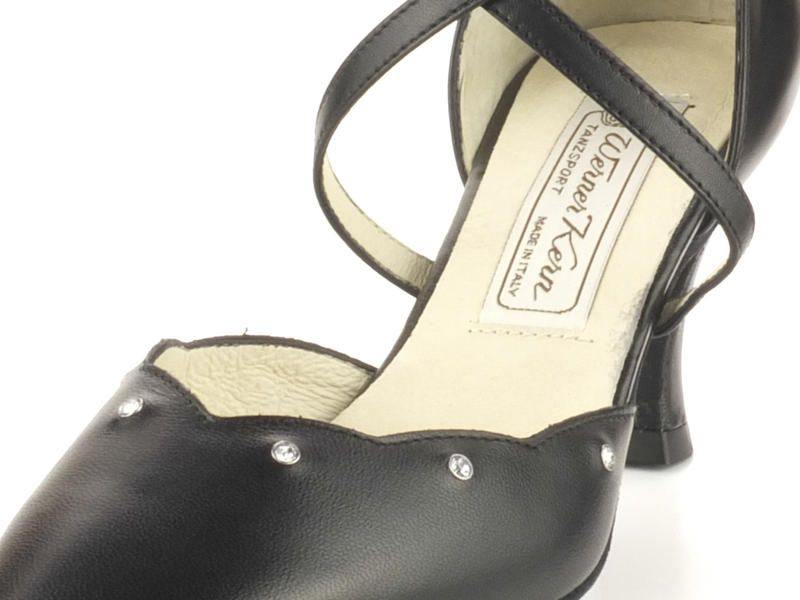 Ohne viel Aufheben bringt Sie dieser elegante Werner Kern Damen Standard-Tanzschuh aus schwarzem Nappaleder in die richtige Tangostimmung. Der geschlossene Pumps mit spitz zulaufender Vorderpartie und Wellenschnitt mit integrierten exclusiven Strasselementen verschlankt die Silhouette Ihrer Füße und lässt Sie Ihre Schritte noch präziser ausführen. Fixieren Sie den Schuh sicher und stufenlos mit dem hohen Kreuzriemen und geben Sie so den Blick auf Ihren Spann frei.
